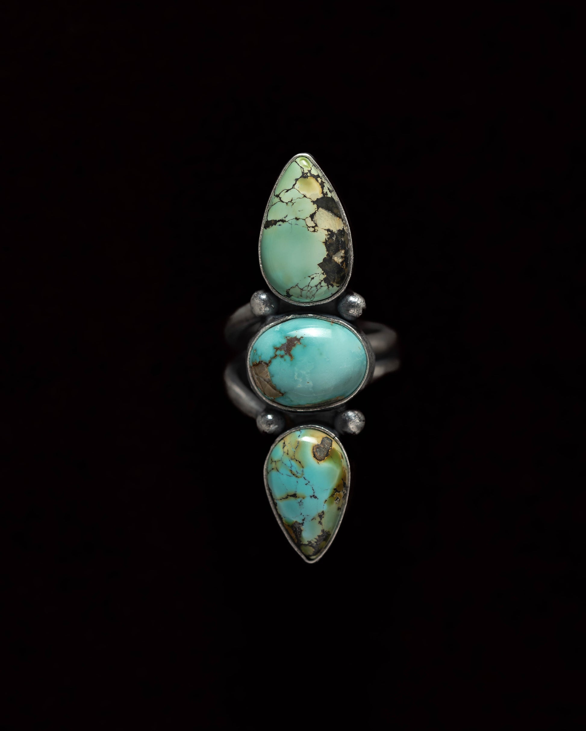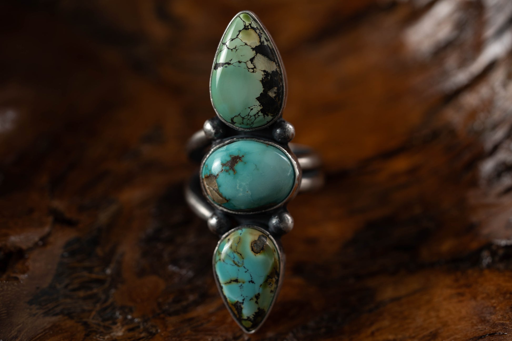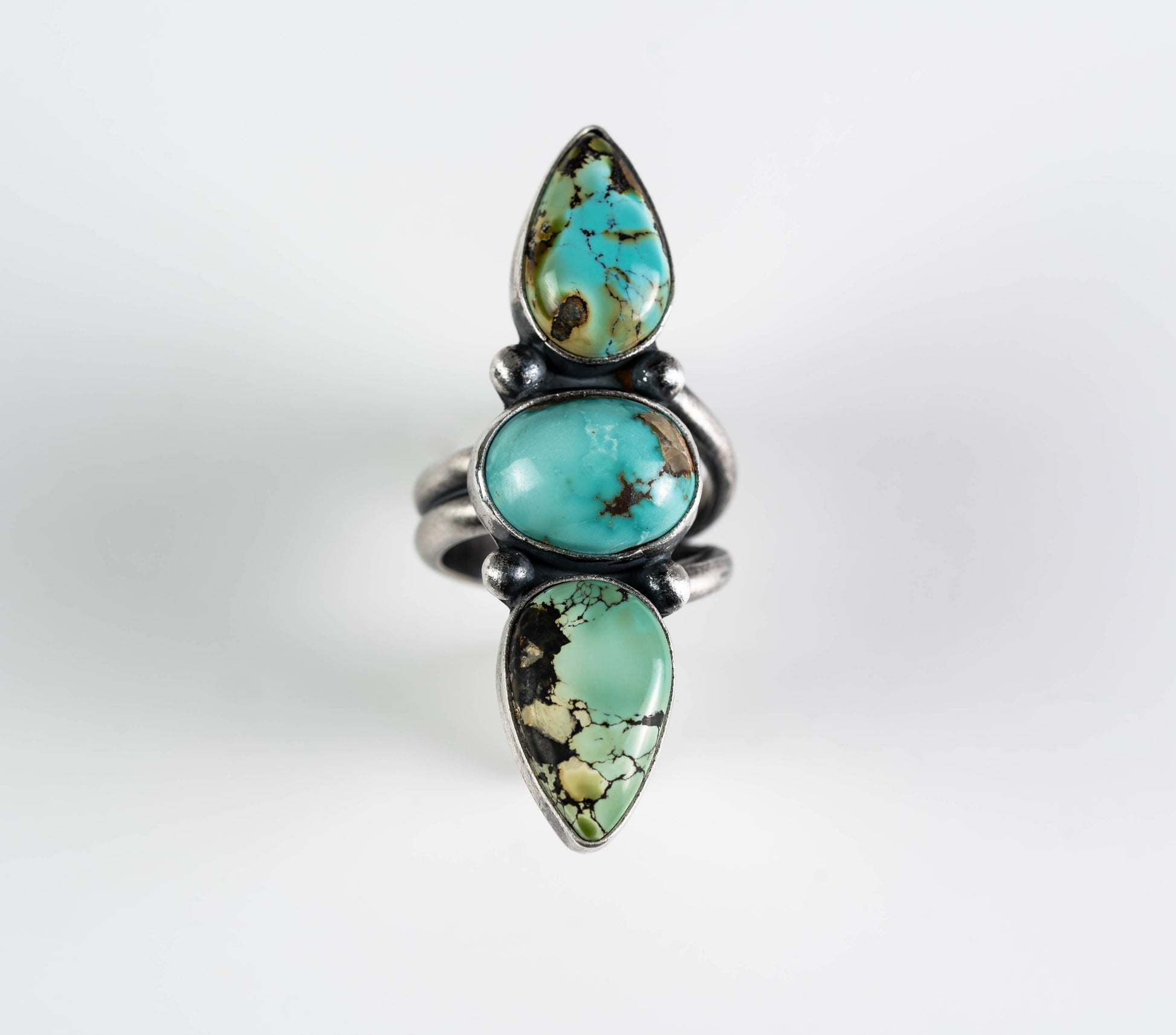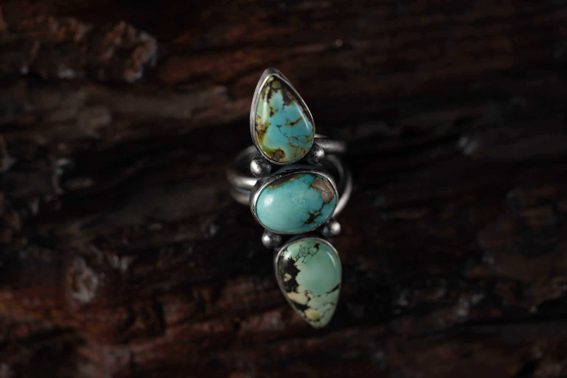 Elevate your jewelry collection with this exquisite Adjustable Three-Stone Turquoise Sterling Silver Ring. Handcrafted with precision, this ring features three captivating turquoise stones set in high-quality sterling silver. The adjustable band ensures a comfortable fit for various finger sizes, making it a versatile addition to any ensemble. Whether you're dressing up for a special occasion or adding a touch of elegance to your everyday look, this ring offers timeless beauty and adaptability
