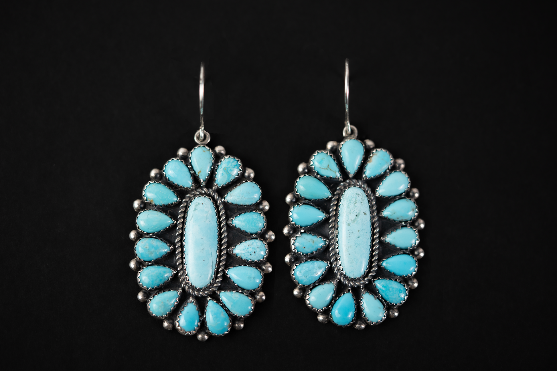 Natural Campitos turquoise, shaped and set in fine silver bezels. Rope wire and sterling beads frame each stone in a classic cluster. The silver is oxidized to deepen every line. Entirely hand-fabricated, including the ear wires.