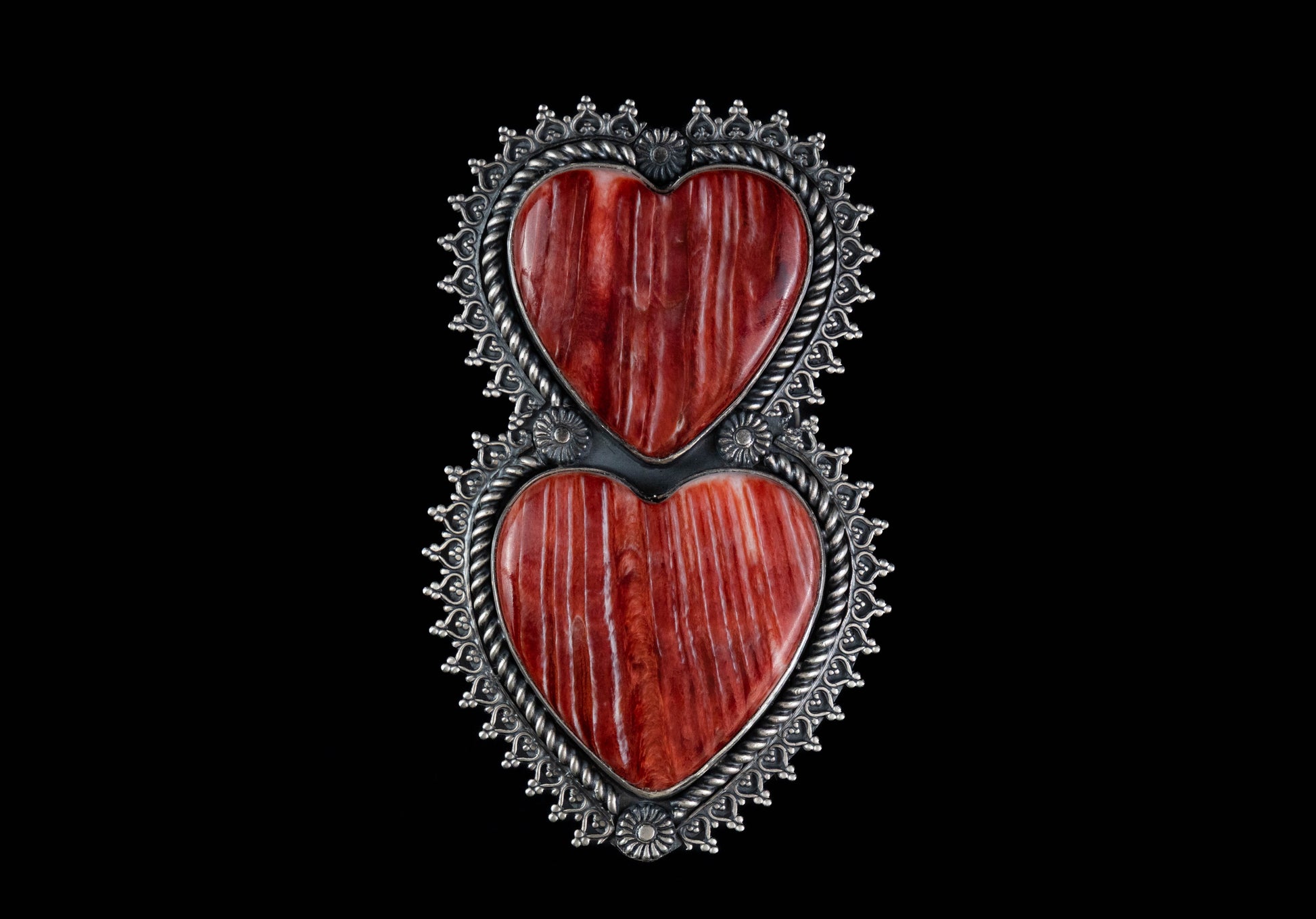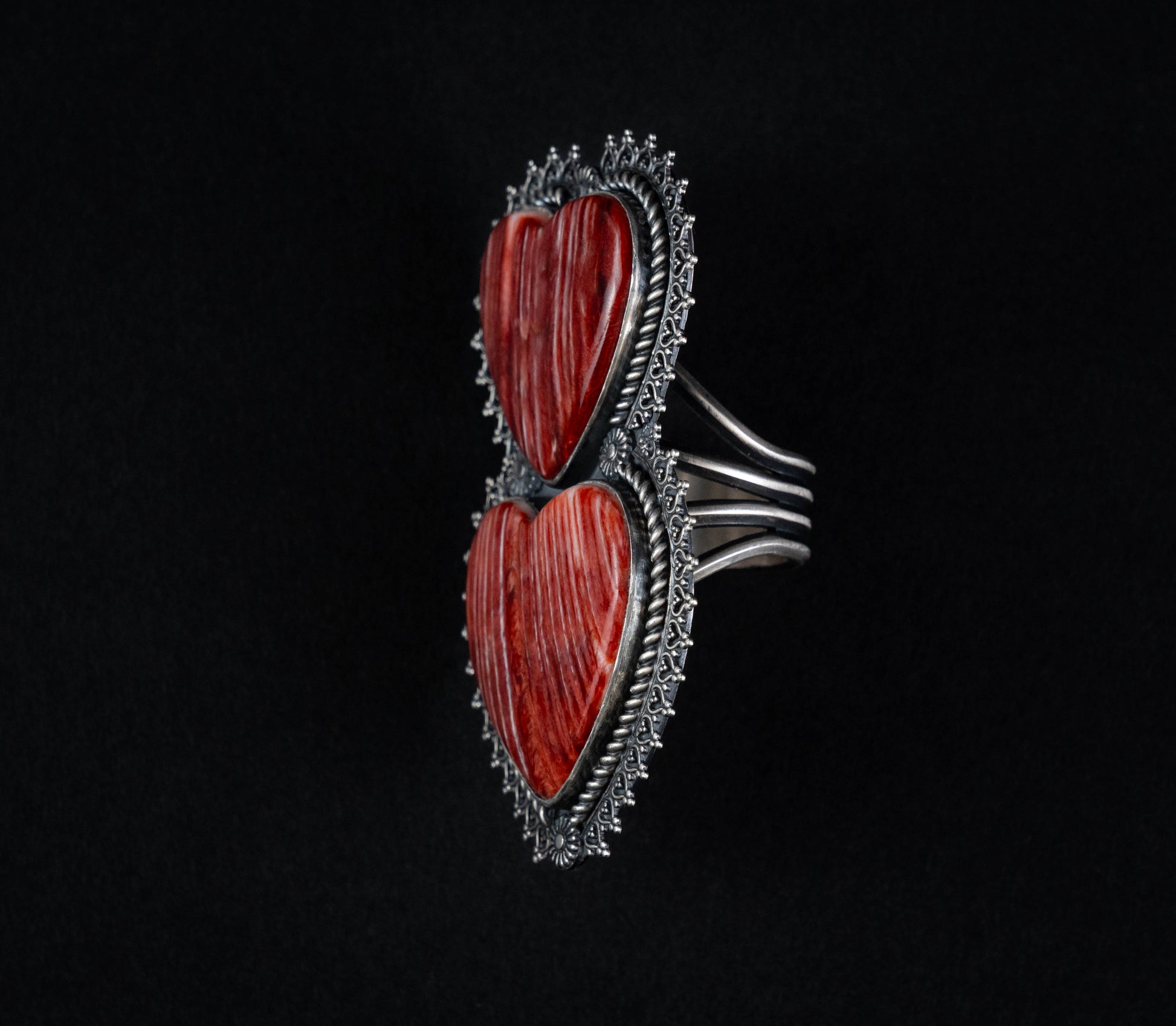 Double Heart Red Spiny Oyster Shell Ring – Handcrafted Sterling Silver, Size 10.5