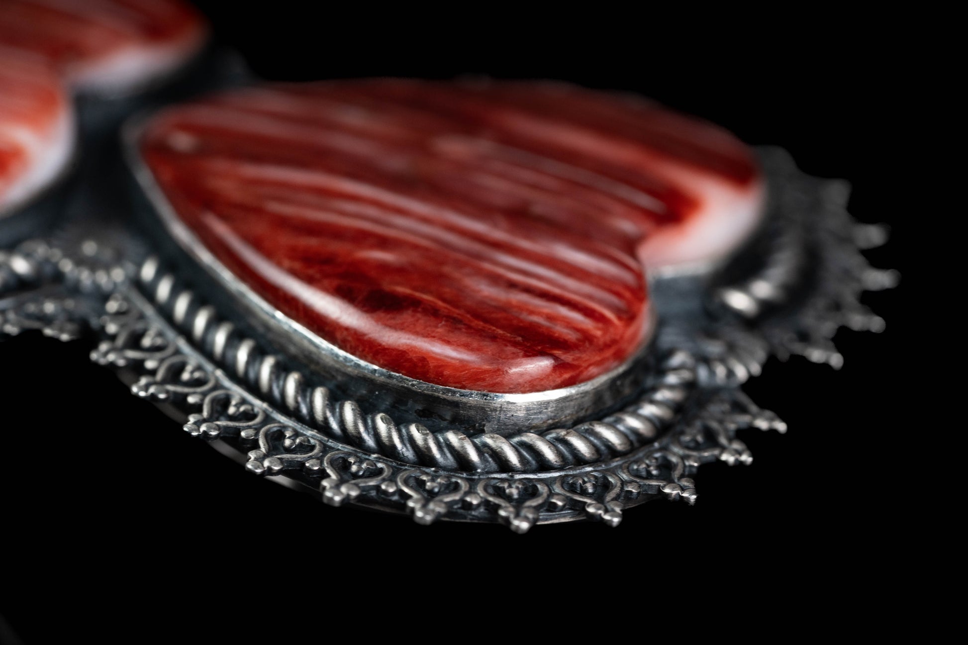 I set two red spiny oyster hearts side by side, their white striations running like fault lines through stone. They are twins—cut from the same shell, shaped by the same tides. The silver holds them steady, its edge plain, clean, as it should be.