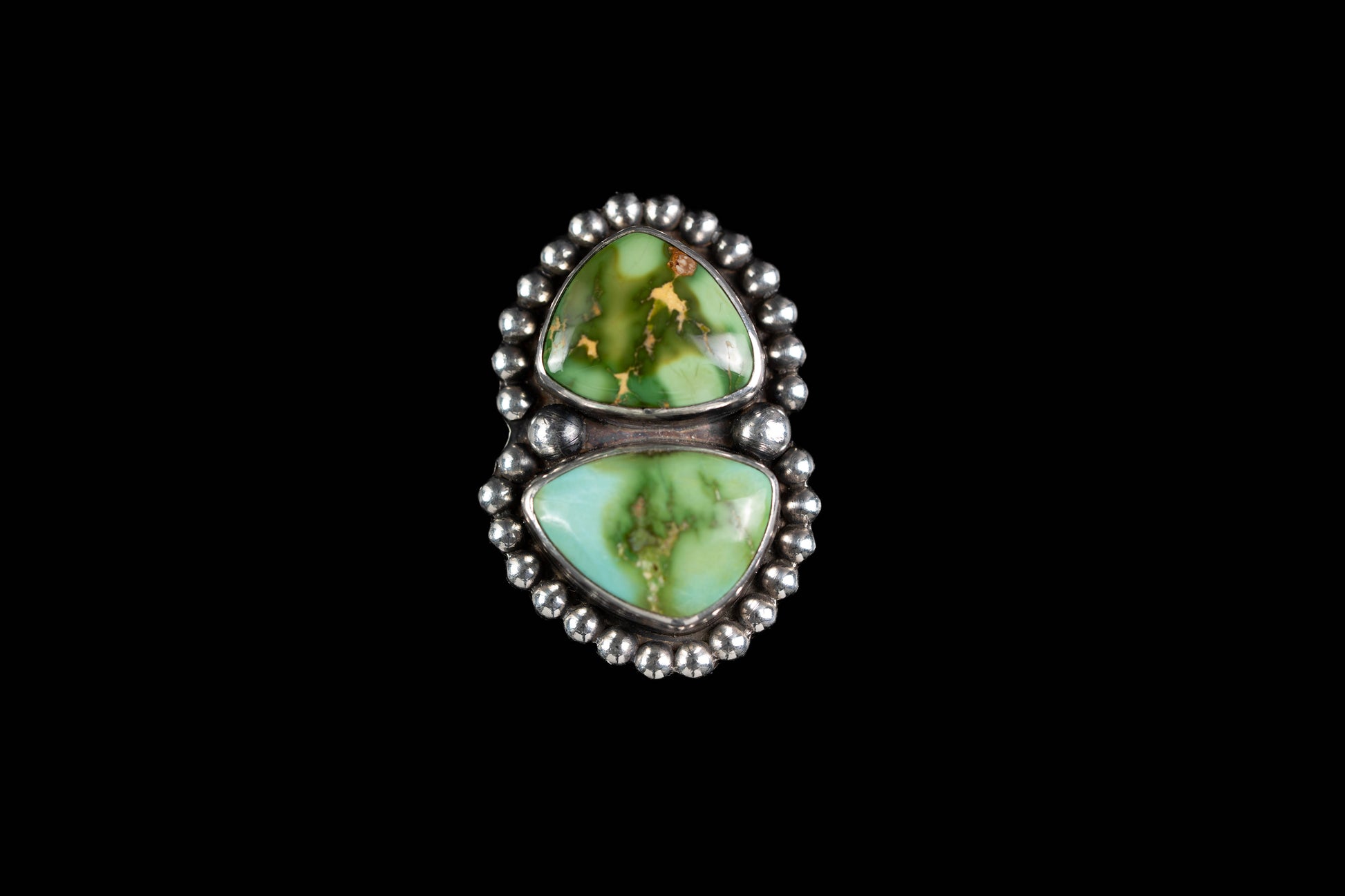 Discover the elegance of the Green Double Stone Turquoise Ring. This handcrafted piece features two genuine green turquoise stones set in high-quality sterling silver. The adjustable band ensures a comfortable fit for various finger sizes, making it a versatile addition to any jewelry collection.