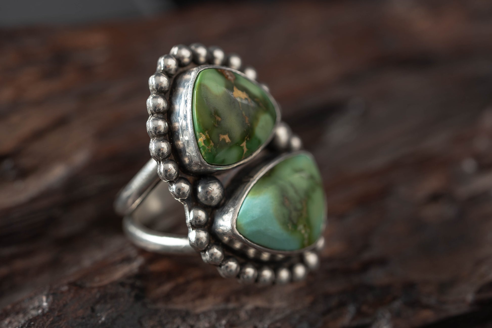 Embrace the fusion of natural beauty and artisan craftsmanship with this Green Double Stone Turquoise Ring. Its versatile design makes it a staple accessory, whether you're channeling a bohemian vibe, enhancing a professional outfit, or adding a touch of elegance to your evening wear. The ring's adaptability ensures it complements both minimalist and eclectic wardrobes, making it a cherished piece for years to come.