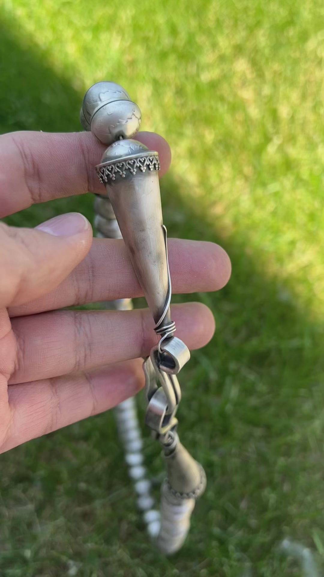 I crafted this necklace with a fixed length of 29 inches, weighing 281 grams. The beads are made from authentic vintage Mercury dimes, each domed, sanded, and soldered by hand. I drilled and widened holes through each bead to fit the chain. The cones and clasp are sterling silver; the cones feature heart-shaped lace details at their base, a design I developed myself. The substantial hook and eye clasp, forged from half round wire, secures the weight.