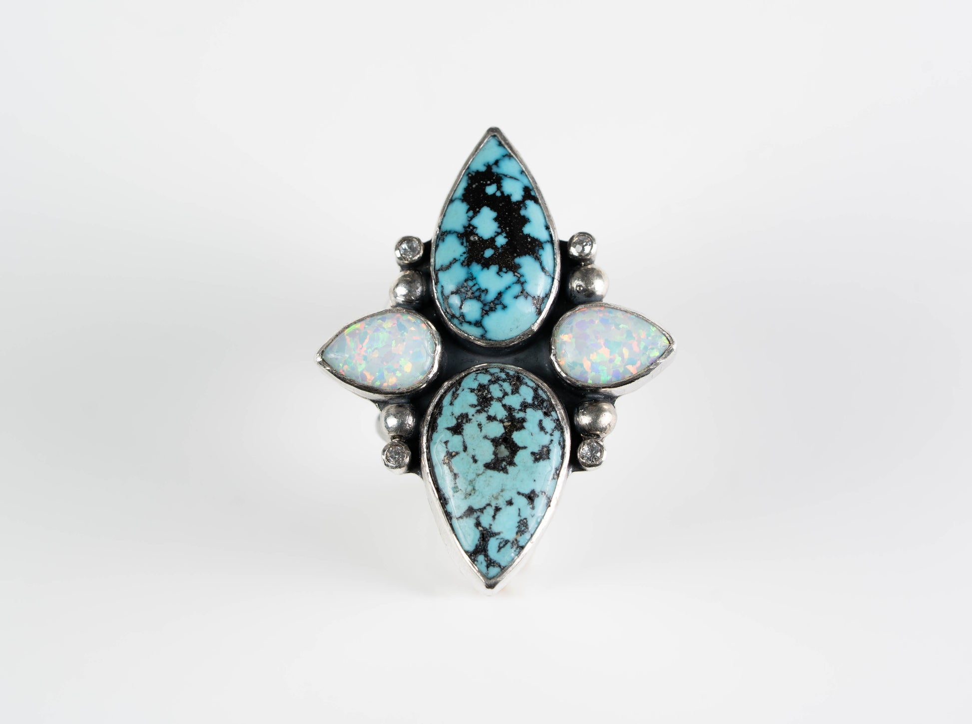 Experience the harmonious blend of vibrant colors and elegant design with the Opal and Turquoise Four-Stone Ring. This handcrafted piece features two high-grade black web Kingman turquoise stones and two luminous lab-created opals, all set in premium 925 sterling silver. Accentuated by four small cubic zirconia stones nestled among delicate silver beadwork, this size 7 3/4 ring offers a captivating aesthetic that complements both casual and formal attire.