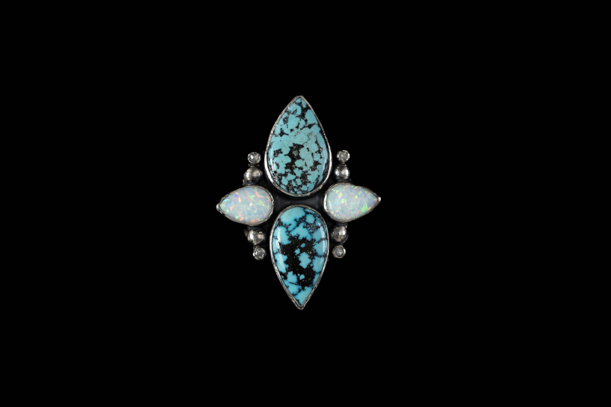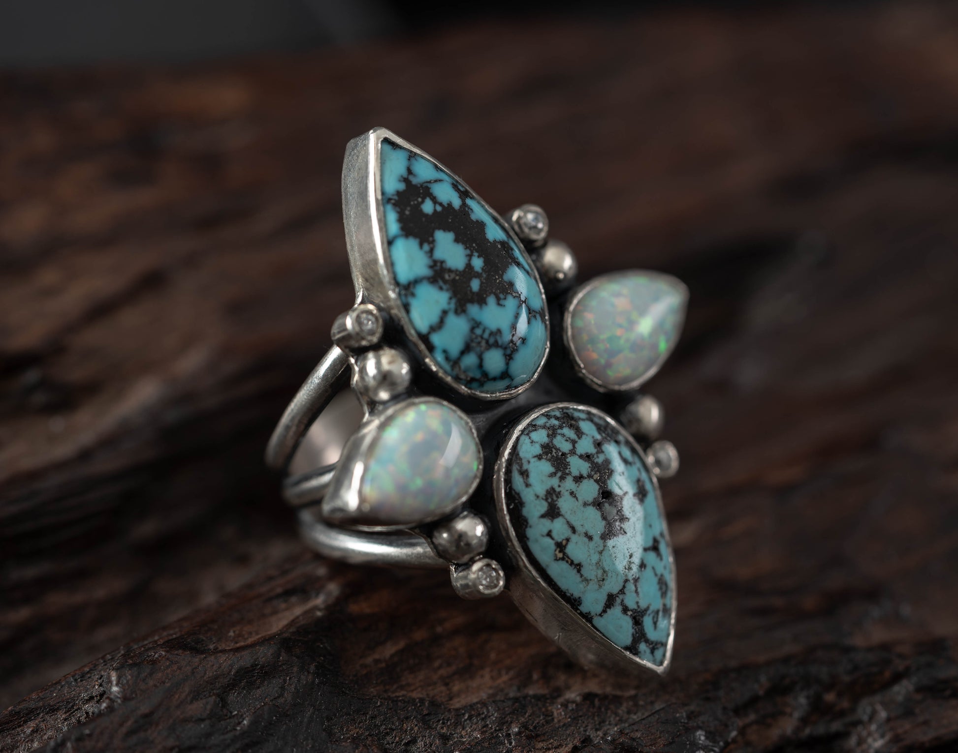 The Opal and Turquoise Four-Stone Ring seamlessly blends traditional craftsmanship with contemporary design. Its vibrant stones and intricate detailing make it a standout piece, whether you're dressing up for a formal event or adding a touch of elegance to your everyday ensemble. This ring not only enhances your style but also reflects a deep appreciation for artisanal jewelry.