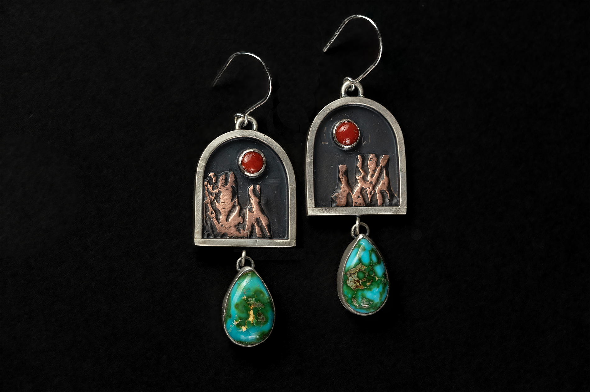 All silver used is sterling, including the oxidized background, bezels, and hand-pulled ear wires. The Monument Valley mittens are hand carved copper.
