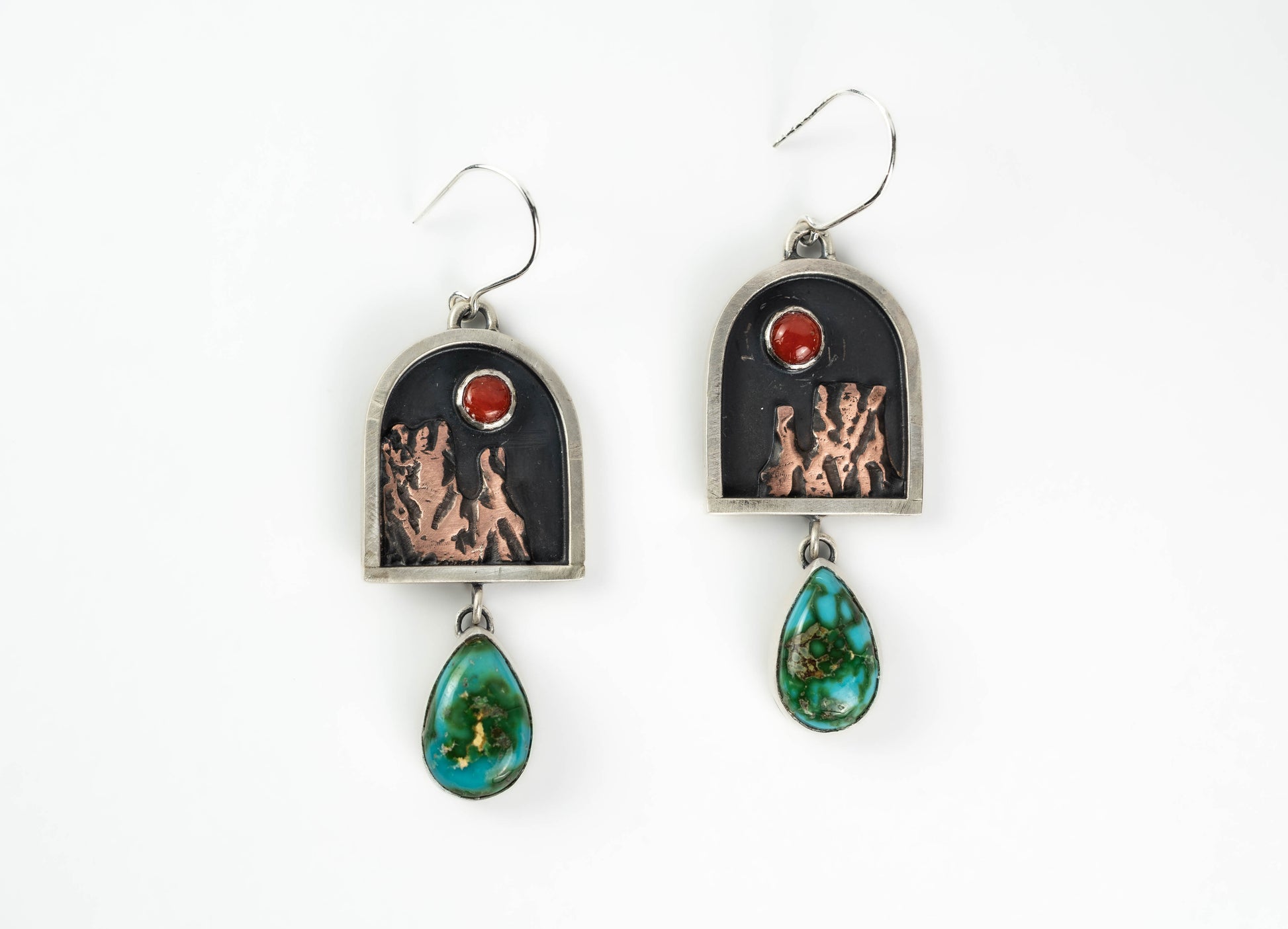 These arch portrait-frame earrings depict a red coral sun over Monument Valley, with a teardrop of turquoise swaying below. The scene is quiet, but nothing is still; they move with the wearer, catching just enough light to be remembered.