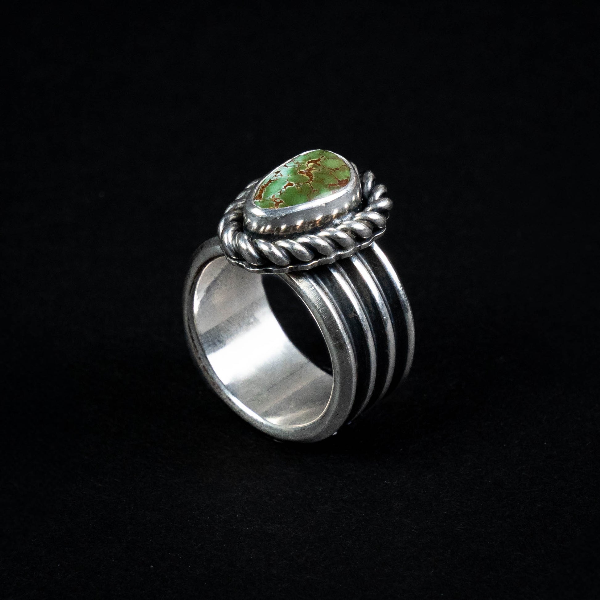 I rolled the silver by hand, shaped the band to hold its weight, and twisted the rope wire with care, building this ring to endure. At its heart is a gem-grade Royston turquoise, its green hues marked by veins of copper like rivers cutting through stone. The bezel holds it firm, a quiet strength balancing the stone’s vibrance.