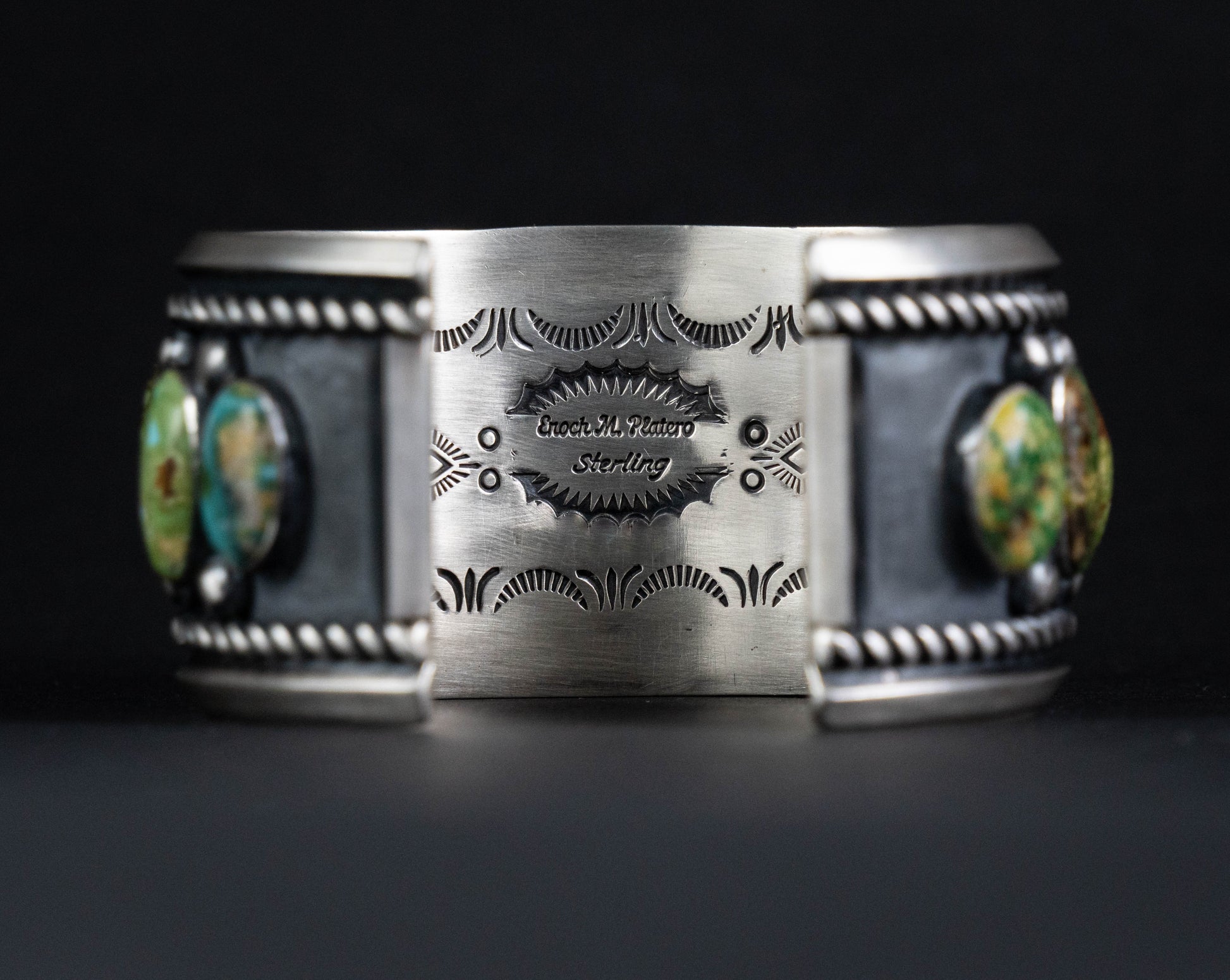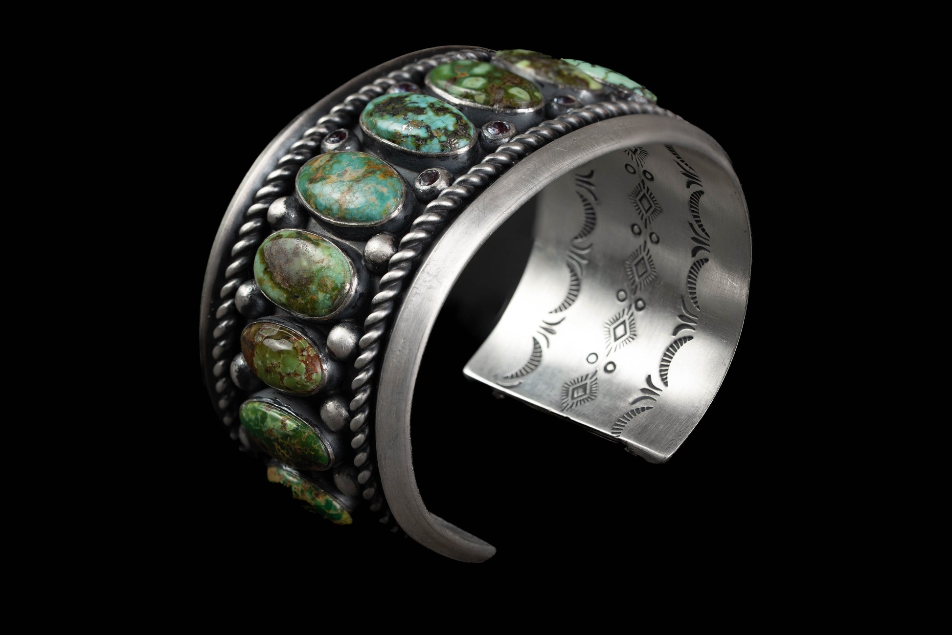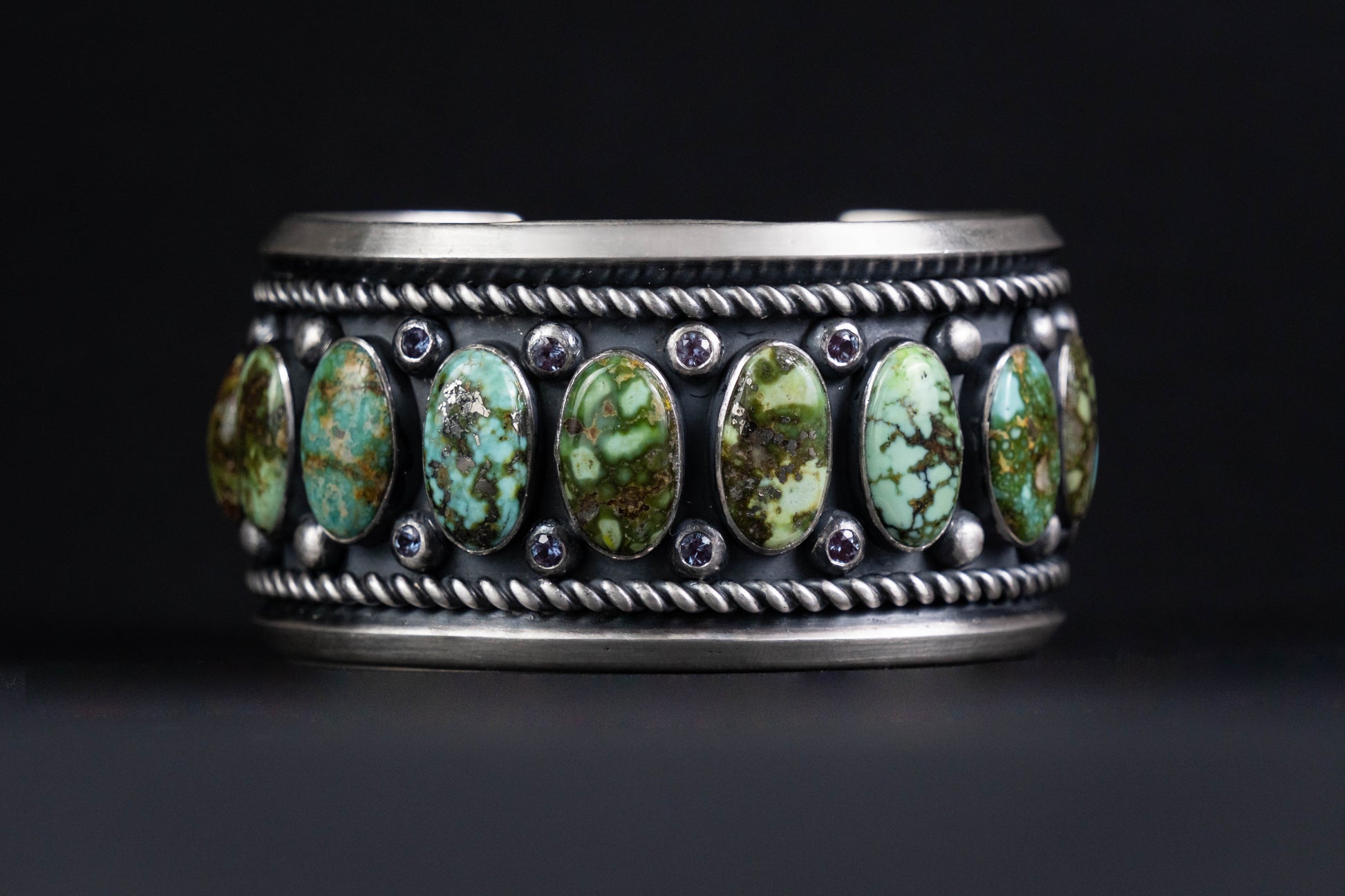A sterling silver cuff with 13 Sonoran Gold turquoise cabochons and 8 rare natural alexandrite gemstones, embodying cycles, balance, and harmony.