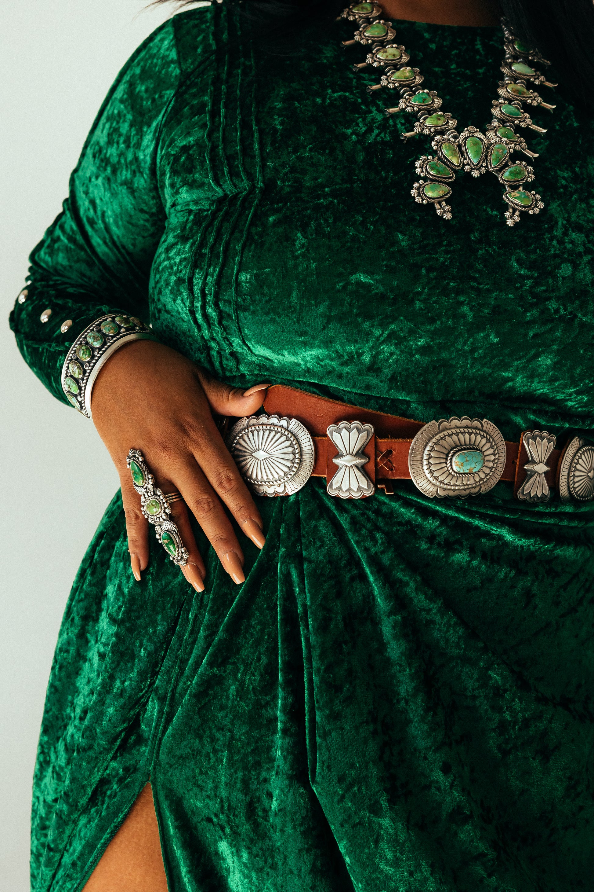 This piece carries cycles, harmony, and connection. I brought together thirteen turquoise stones and eight alexandrites, shaping a design rooted in the rhythms of the natural world. Every element was forged by hand from recycled silver, each strike of the stamp pressed with intent—patterns unseen yet essential, like the forces that shape the land.