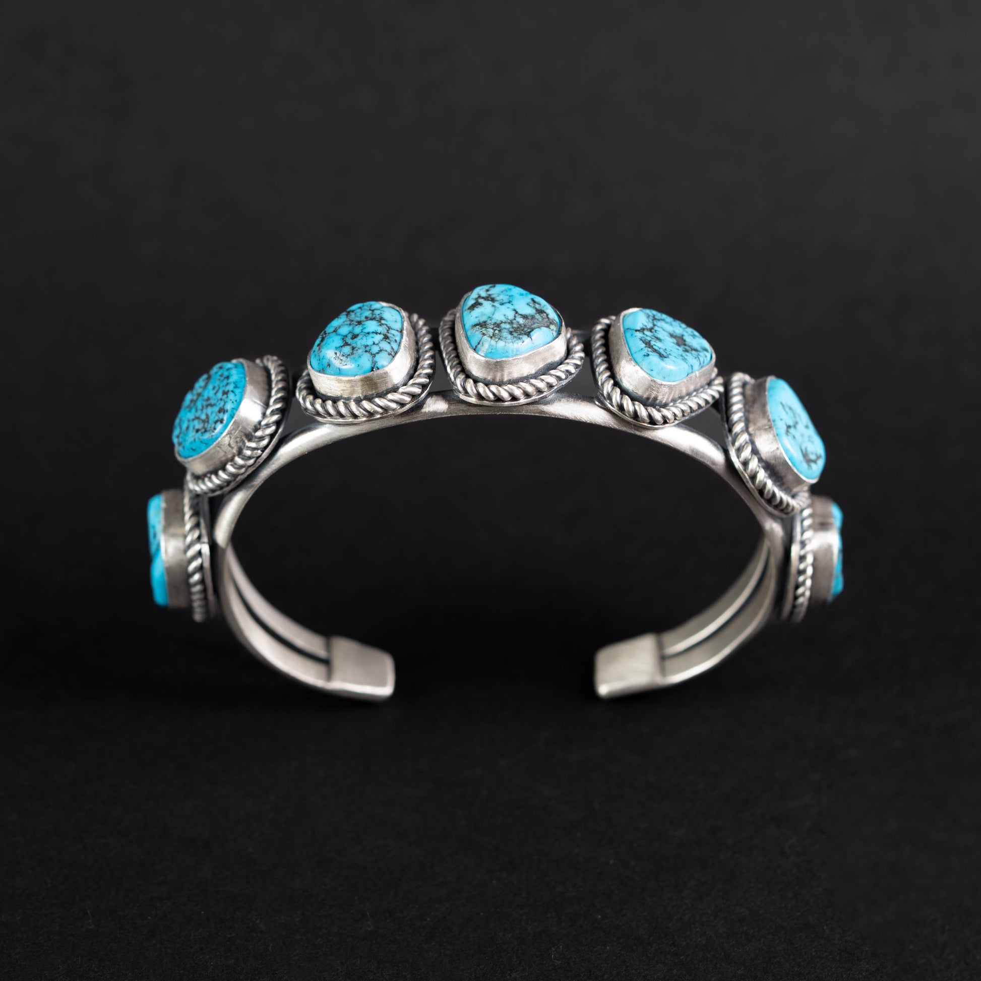 A line of natural Sleeping Beauty turquoise runs across this cuff, set in plain bezels and framed with twisted wire. The bright robin’s egg blue contrasts against the oxidized sterling silver. Clean, classic, and made to be worn.