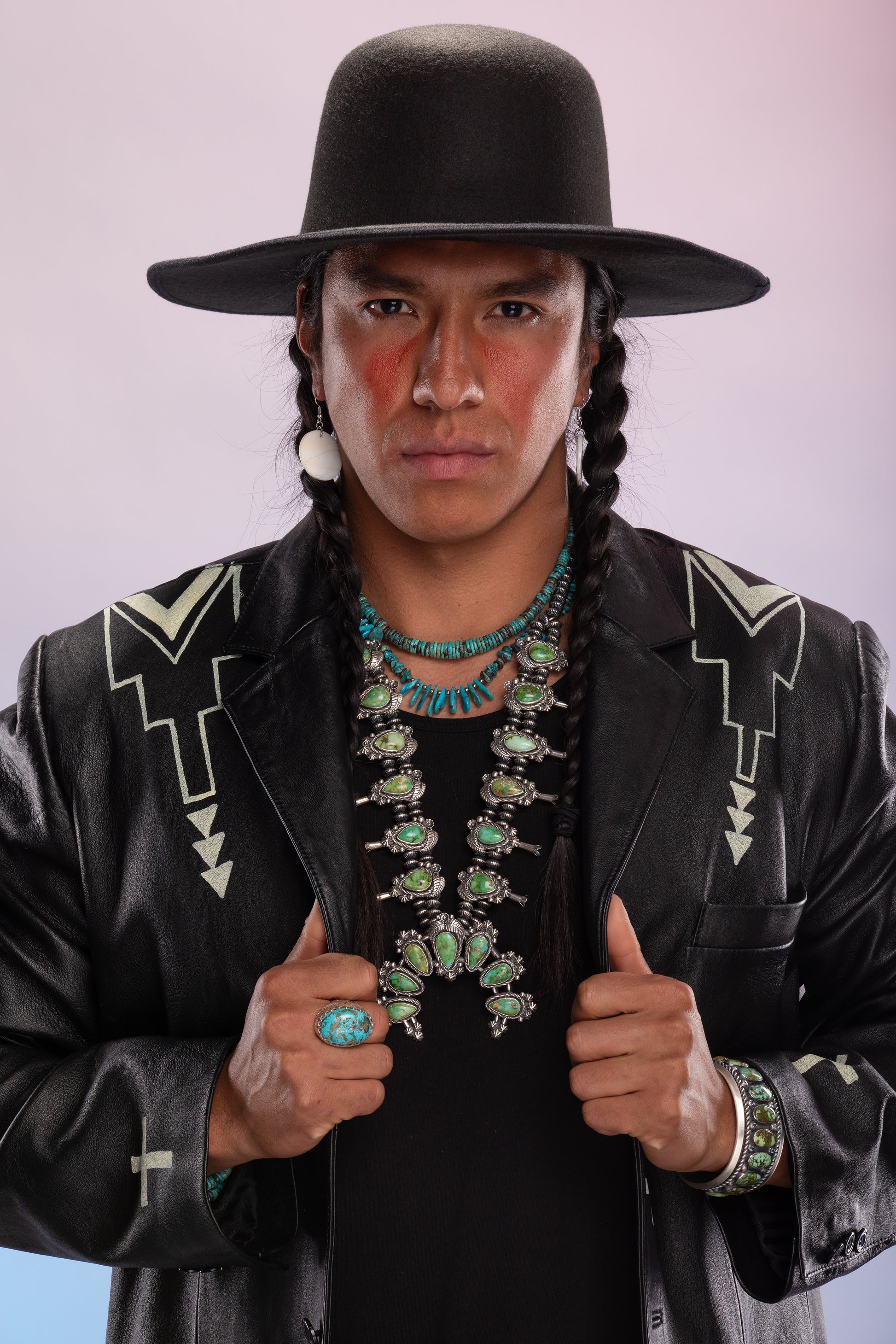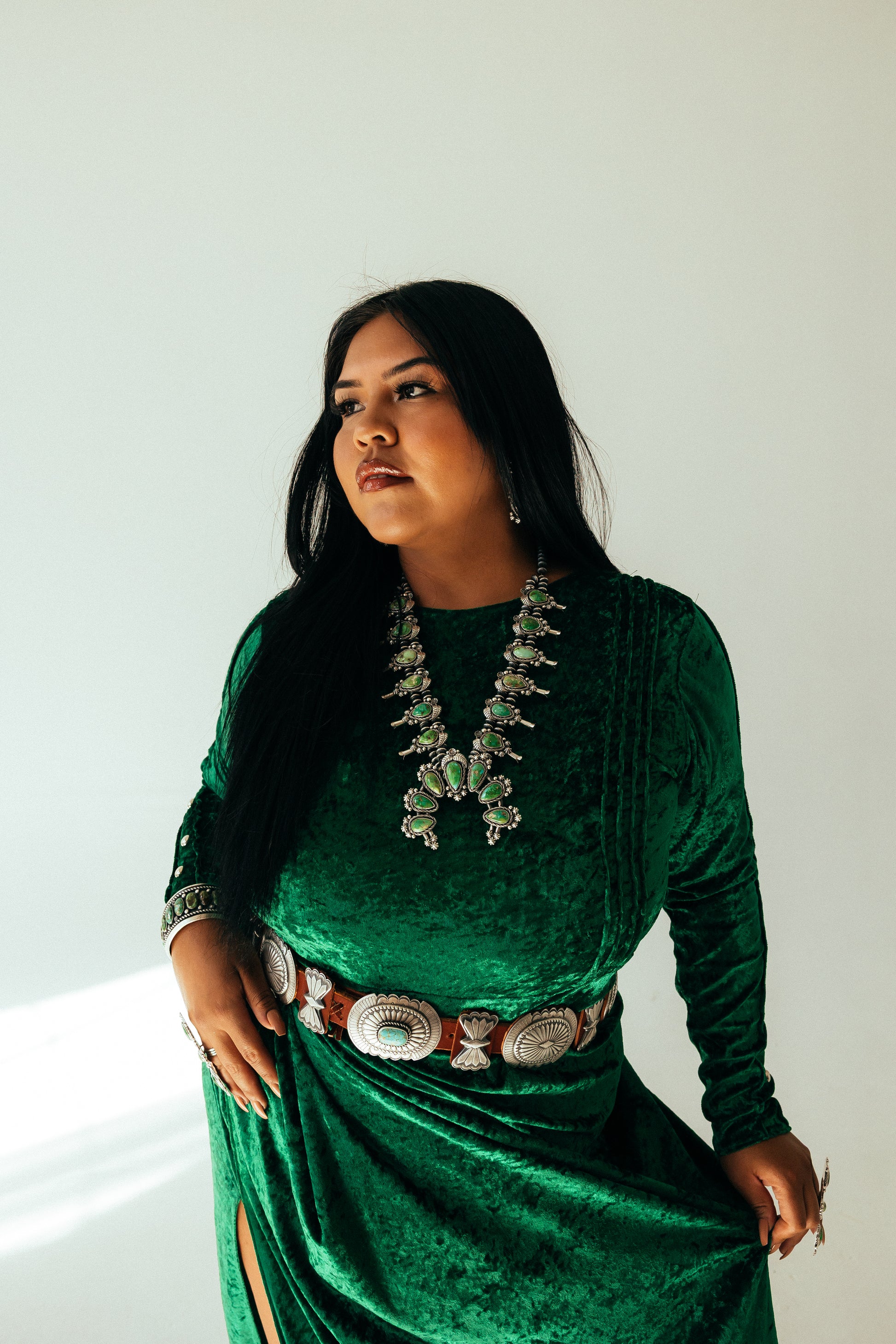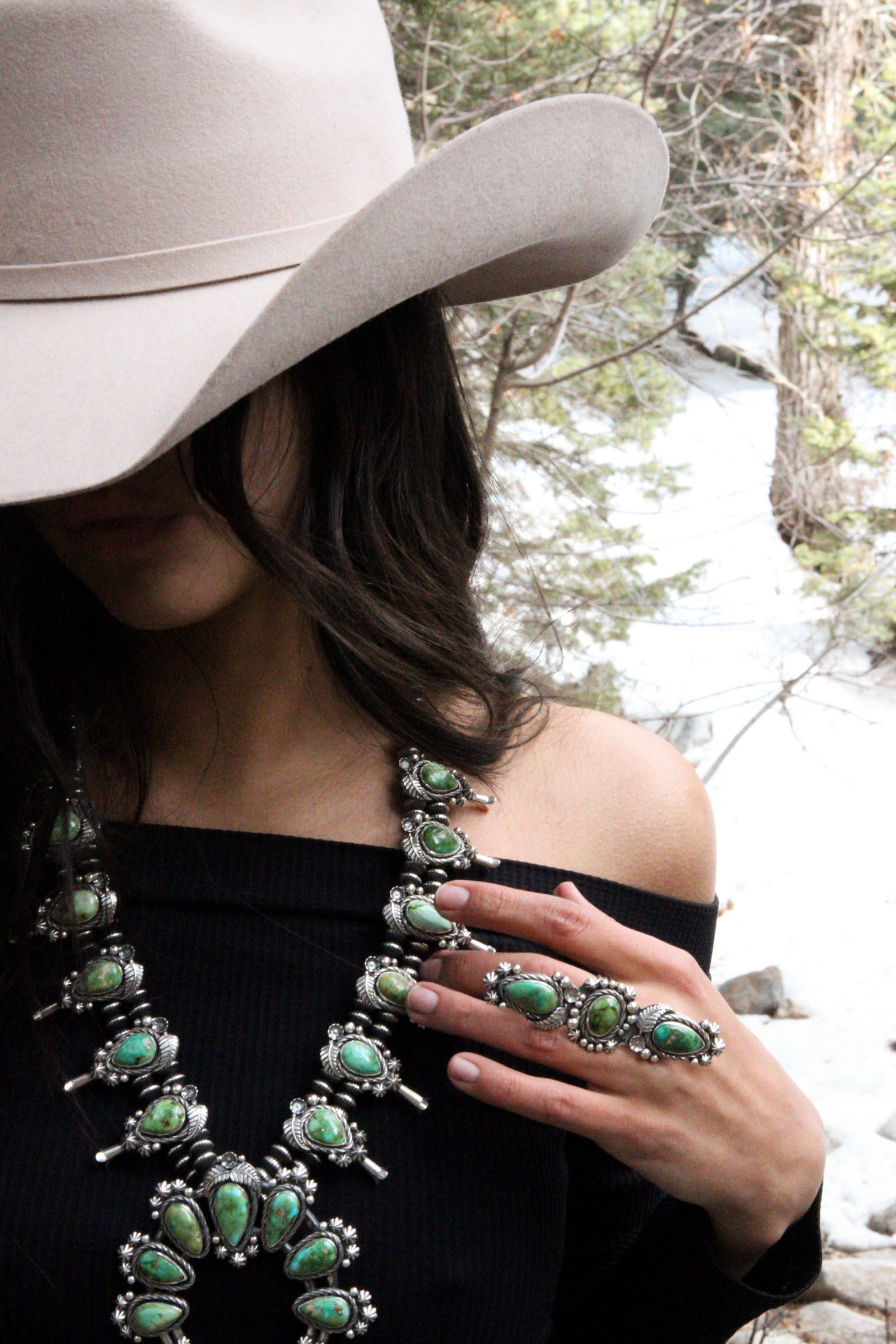 High-grade Sonoran Gold turquoise rests in each setting, its greens and blues shifting like land against sky. The metal, all sterling and fine silver, was shaped entirely by hand—every blossom, every curve of the naja, every mark pressed with purpose.