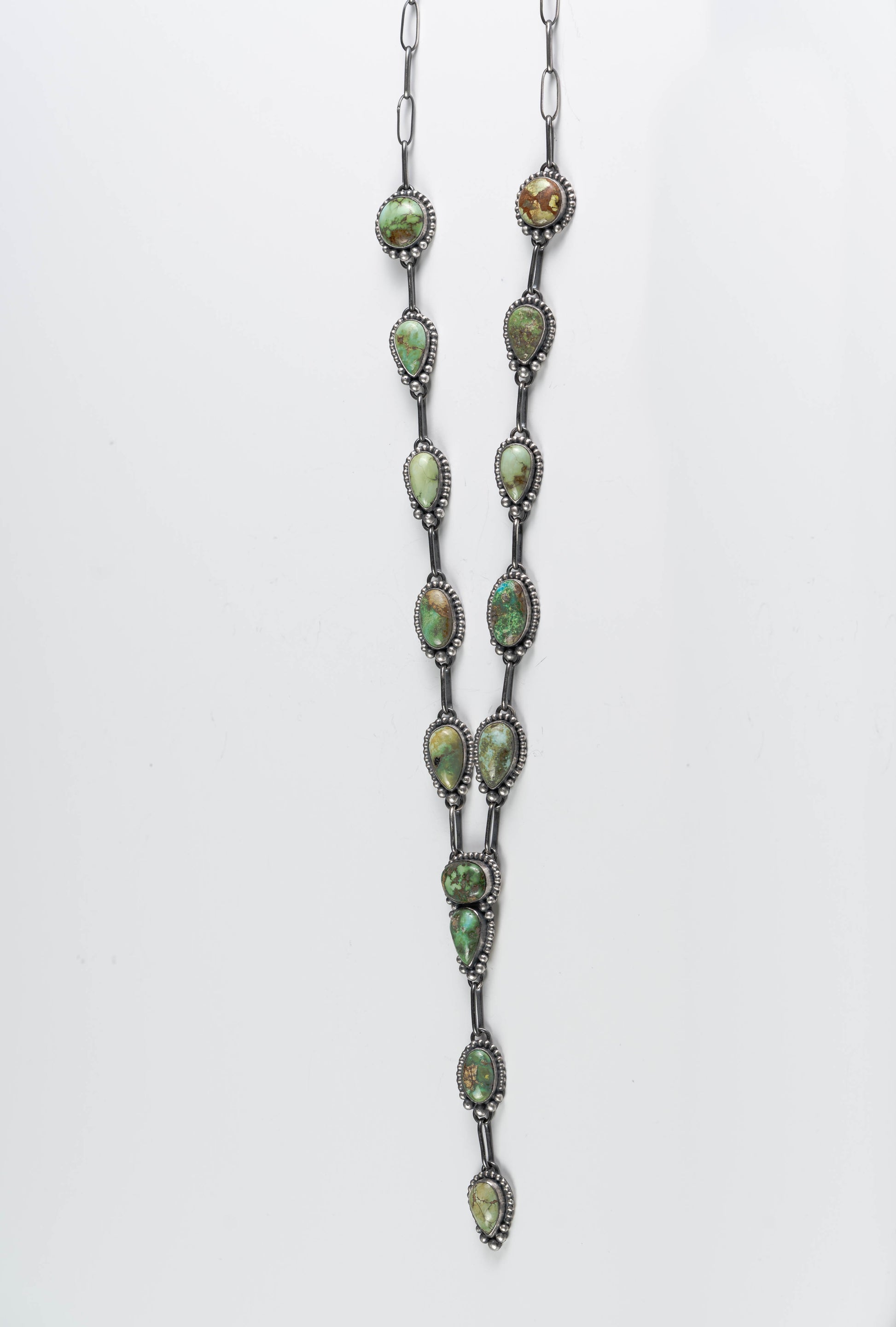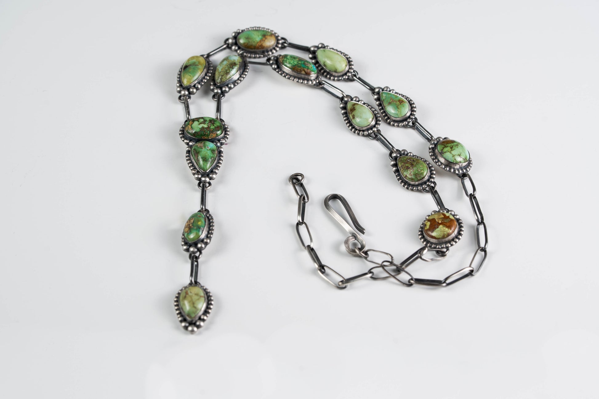 A 16-stone necklace linked in a graduated drop, each turquoise set in a plain fine silver bezel. The stones vary in tone, from golden green to deep moss, with traces of host rock preserved. The chain and findings are entirely hand fabricated in sterling silver.