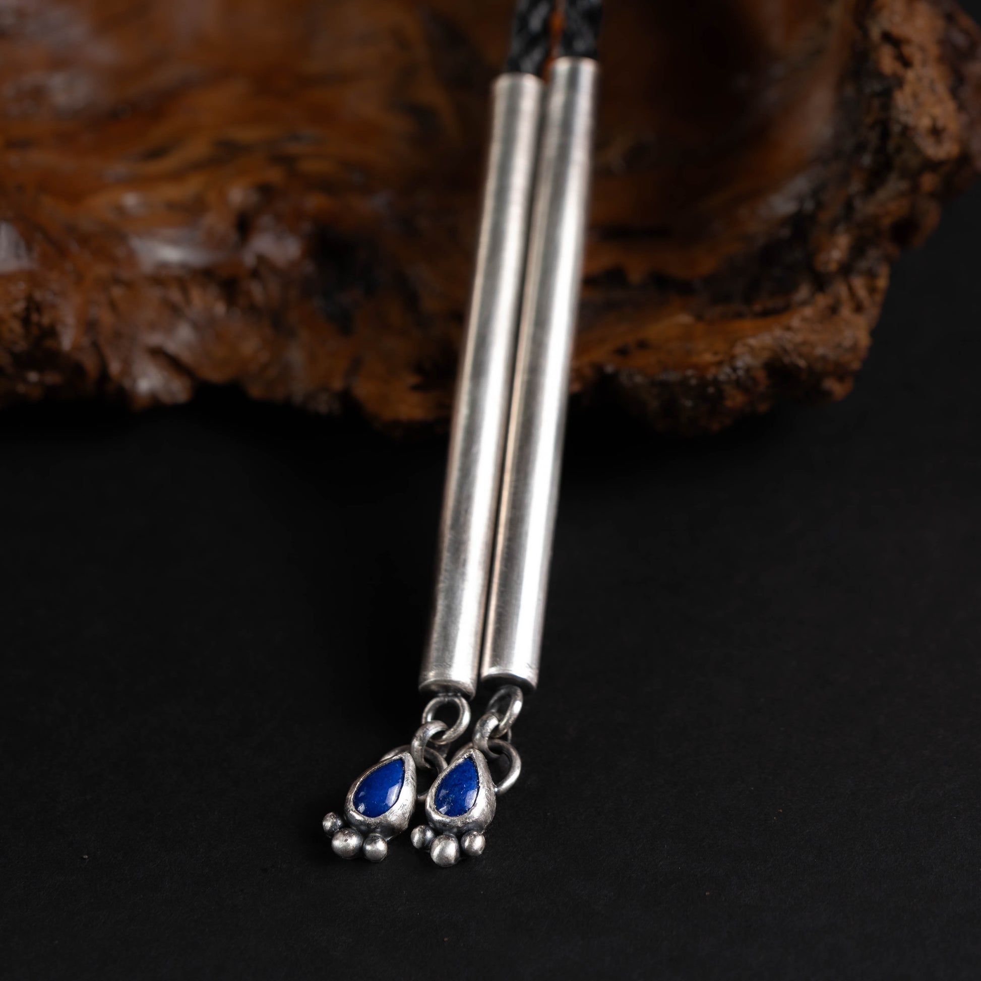 They’re lapis lazuli, set in sterling, attached to hand-cut tubing.