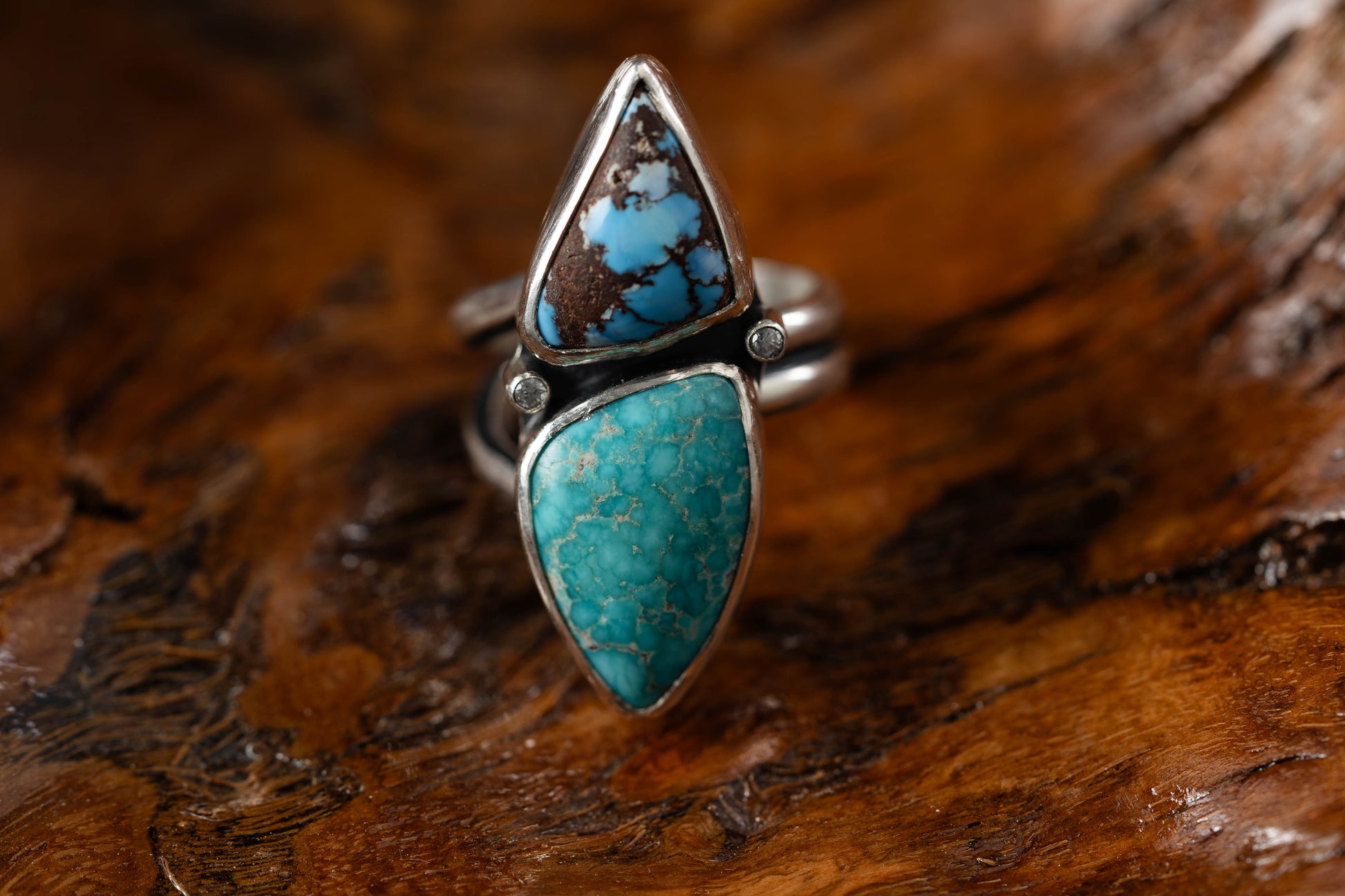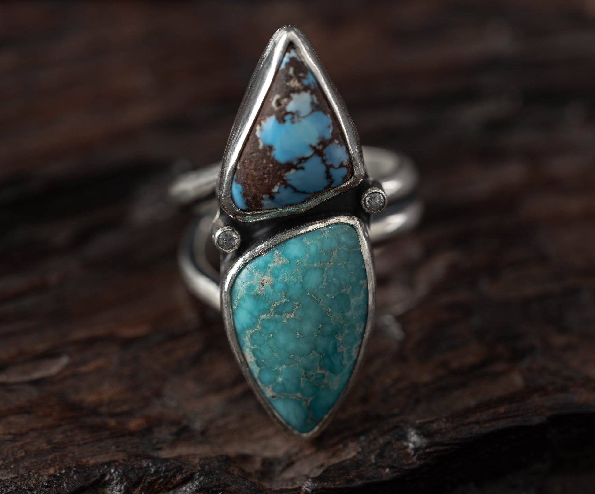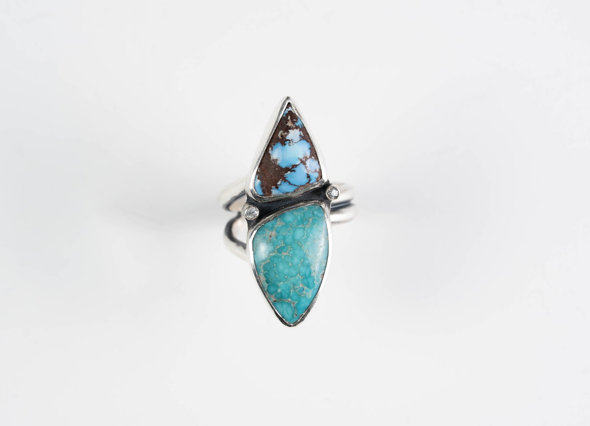 This handcrafted ring features a bold pairing of two rare turquoise stones set in sterling silver. A White Water turquoise and a Golden Hills lavender turquoise are carefully placed in a modern vertical design, accented by two tube-set cubic zirconia stones. The adjustable sterling silver band allows for a customized fit.